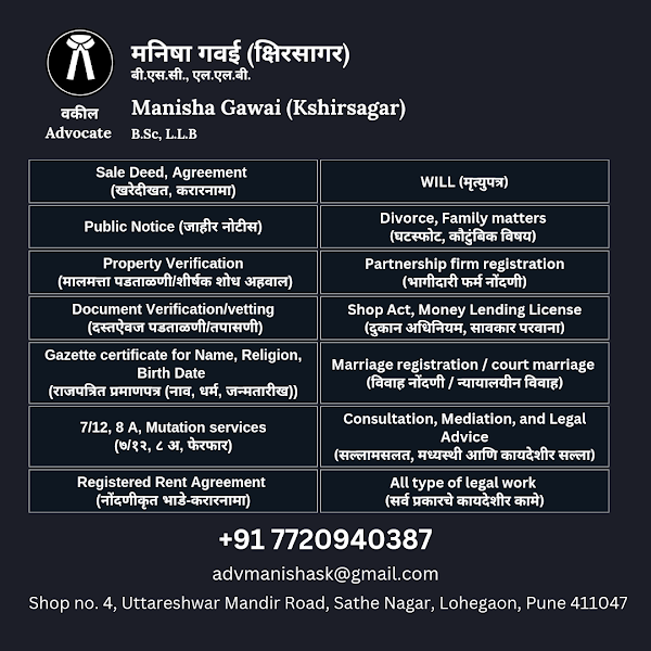 Advocate Manisha Gawai (Kshirsagar) is a legal services provider located in Lohegaon, Pune, Maharashtra. With a rating of 5.0 stars based on 20 reviews, it is a highly regarded choice for legal services in the Lohegaon area. You can reach them at 077209 40387 for appointments or inquiries. They are open most days, 10:00 AM – 7:00 PM. Located at Shop No. 4, Uttareshwar Mandir Rd, Sai Nagar, Sathe Nagar, Lohegaon, Advocate Manisha Gawai (Kshirsagar) serves residents of Lohegaon and nearby areas including Dhanori, Wagholi, Viman Nagar. Providing legal consultation and services to clients in Lohegaon and across Pune.
